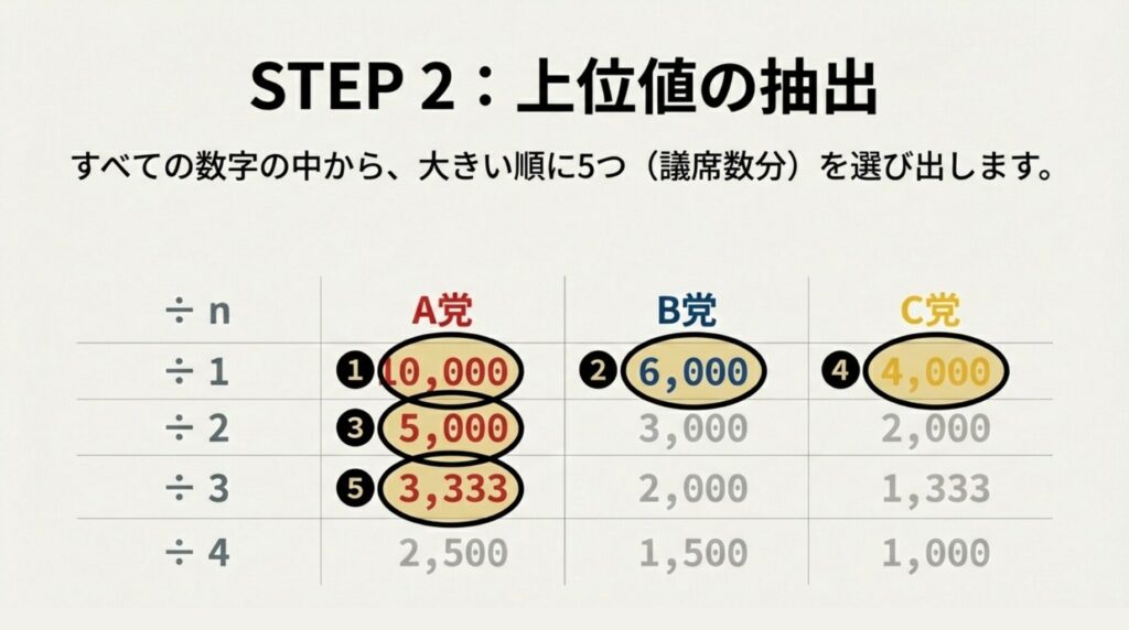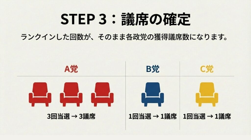 👉 数字の大きい順に議席を決める