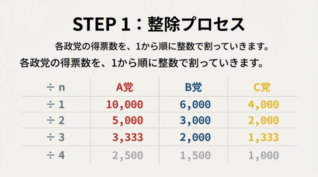 👉 得票数を「1・2・3・4…」と順番に割っていき、